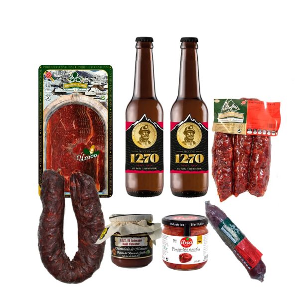 La Caja Gourmet incluye una pequeña y variada selección de productos: unas cervezas artesanas, distintos embutidos de la zona(chorizo, cecina), un quesín exclusivo, conserva de pimientos y algo de dulce, el pack ya incluye el embalaje de regalo (caja de cartón)